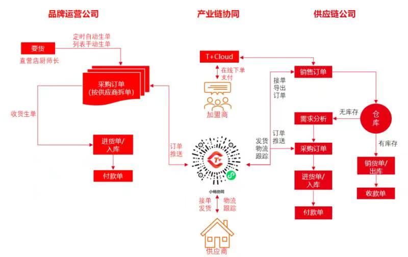 為了滿足餐飲門店要貨頻率高、時效性要求高的需求,遇江南在用友暢捷通T+Cloud的幫助下,應用【智能供應鏈】打通了“門店-供應鏈公司-供應商”三者之間的信息鏈路。