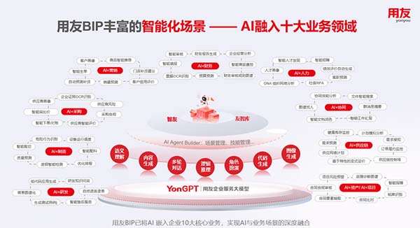 用友企業(yè)服務(wù)大模型YonGPT作為業(yè)界首個(gè)企業(yè)服務(wù)大模型,它融合了企業(yè)各個(gè)領(lǐng)域?qū)I(yè)知識(shí)和各類(lèi)行業(yè)商業(yè)KnowHow,經(jīng)過(guò)領(lǐng)域、行業(yè)數(shù)據(jù)的預(yù)訓(xùn)練和精調(diào)的企業(yè)應(yīng)用服務(wù)的大模型,結(jié)合了用友在企業(yè)服務(wù)領(lǐng)域的經(jīng)驗(yàn)積累、領(lǐng)先并場(chǎng)景豐富的企業(yè)應(yīng)用軟件產(chǎn)品、大規(guī)模企業(yè)客戶基礎(chǔ)的優(yōu)勢(shì),能夠理解、解析各類(lèi)企業(yè)數(shù)據(jù),應(yīng)用于各類(lèi)業(yè)務(wù)場(chǎng)景。其面向復(fù)雜的行業(yè)應(yīng)用場(chǎng)景, 通過(guò)對(duì)行業(yè)模型精調(diào)幫助企業(yè)實(shí)現(xiàn)智能化的業(yè)務(wù)運(yùn)營(yíng)、自然化的人機(jī)交互、智慧化的知識(shí)生成、語(yǔ)義化的應(yīng)用生成四大能力,為企業(yè)提供智能化的人機(jī)協(xié)作、業(yè)務(wù)洞察、商業(yè)決策支持和智能運(yùn)營(yíng)服務(wù),是深懂業(yè)務(wù)的大模型,已完全融入到企業(yè)的“研供產(chǎn)銷(xiāo)服、人財(cái)物客項(xiàng)”業(yè)務(wù)與管理場(chǎng)景中。