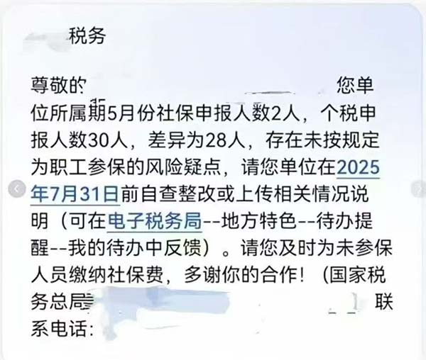 您單位所屬期5月份社保申報(bào)人數(shù)2人,個(gè)稅申報(bào)人數(shù)30人,差異28人,存在未按規(guī)定為職工參保的風(fēng)險(xiǎn)疑點(diǎn),請(qǐng)您單位在2025年7月31日前自查整改或上傳相關(guān)情況說(shuō)明。請(qǐng)您及時(shí)為參保人員繳納社保費(fèi),多謝你的合作!”