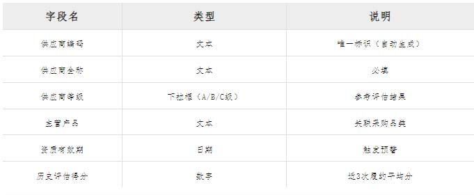 供應(yīng)商注冊(cè)表:字段包括統(tǒng)一社會(huì)信用代碼、評(píng)估狀態(tài)(潛在/合格);
