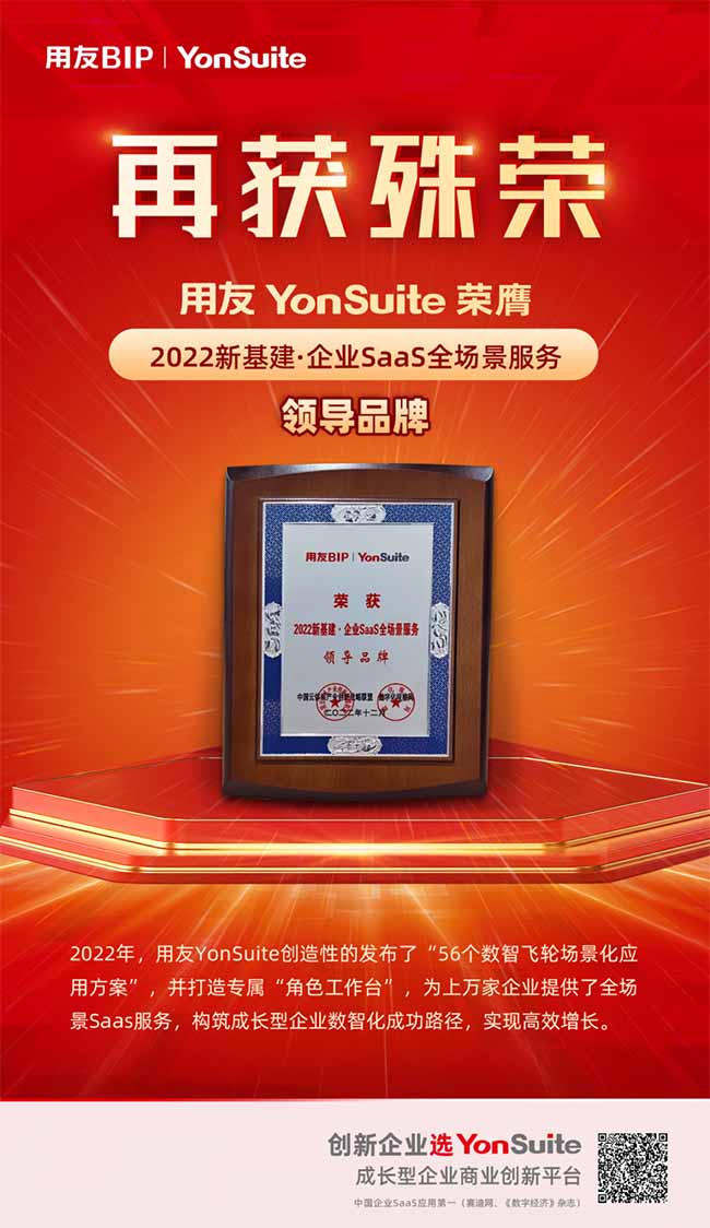 本次評選用友YonSuite榮獲“2022新基建·企業(yè)SaaS全場景服務領導品牌”,以實力引領創(chuàng)新,以技術領先性和創(chuàng)新性驅動企業(yè)高效增長,領跑中國SaaS產業(yè)發(fā)展。